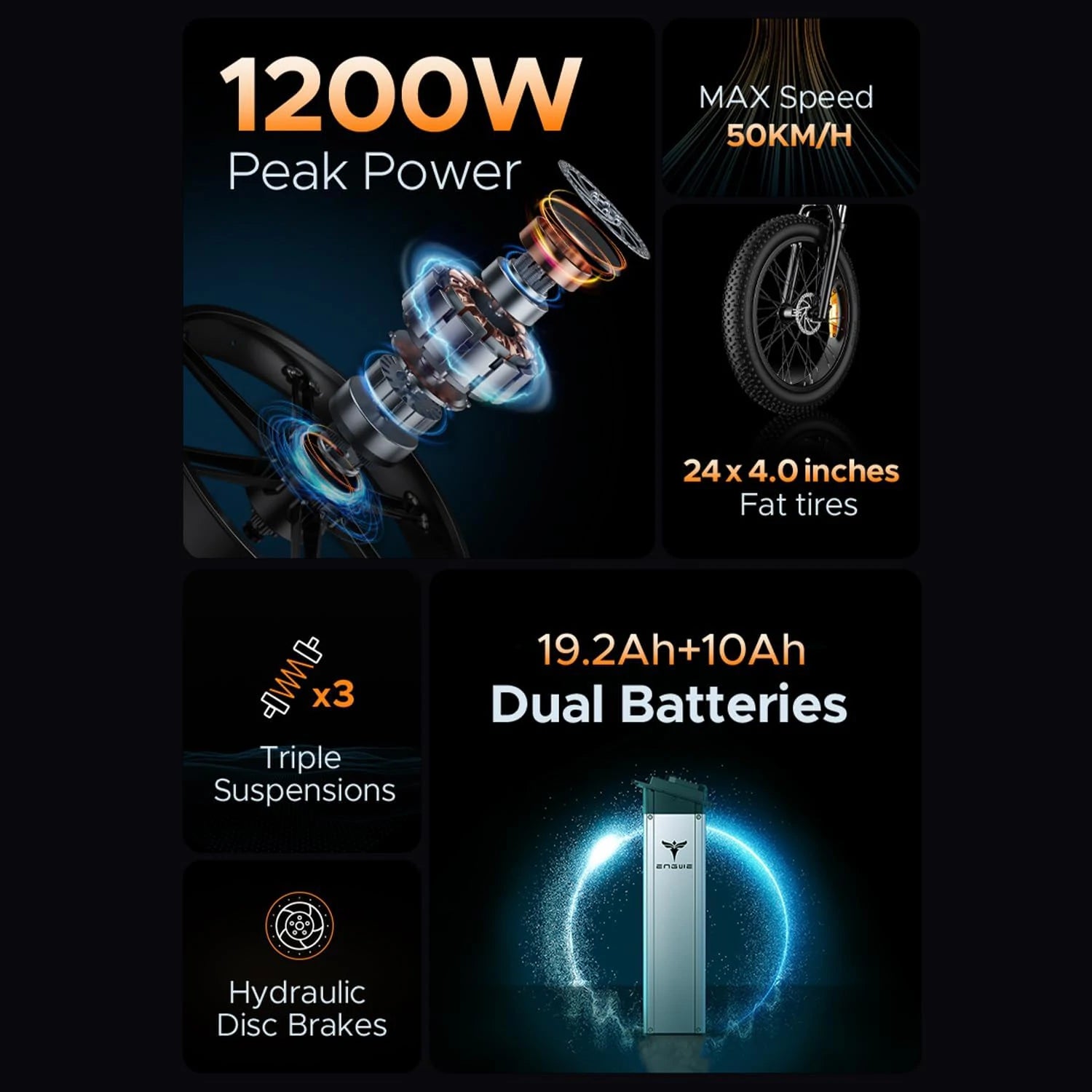 Experience the power and unstoppable speed of the ENGWE electric bike X24, an impressive Electric mountain bike with a top speed of 31 mph and a mind-blowing maximum power of 1200W.?