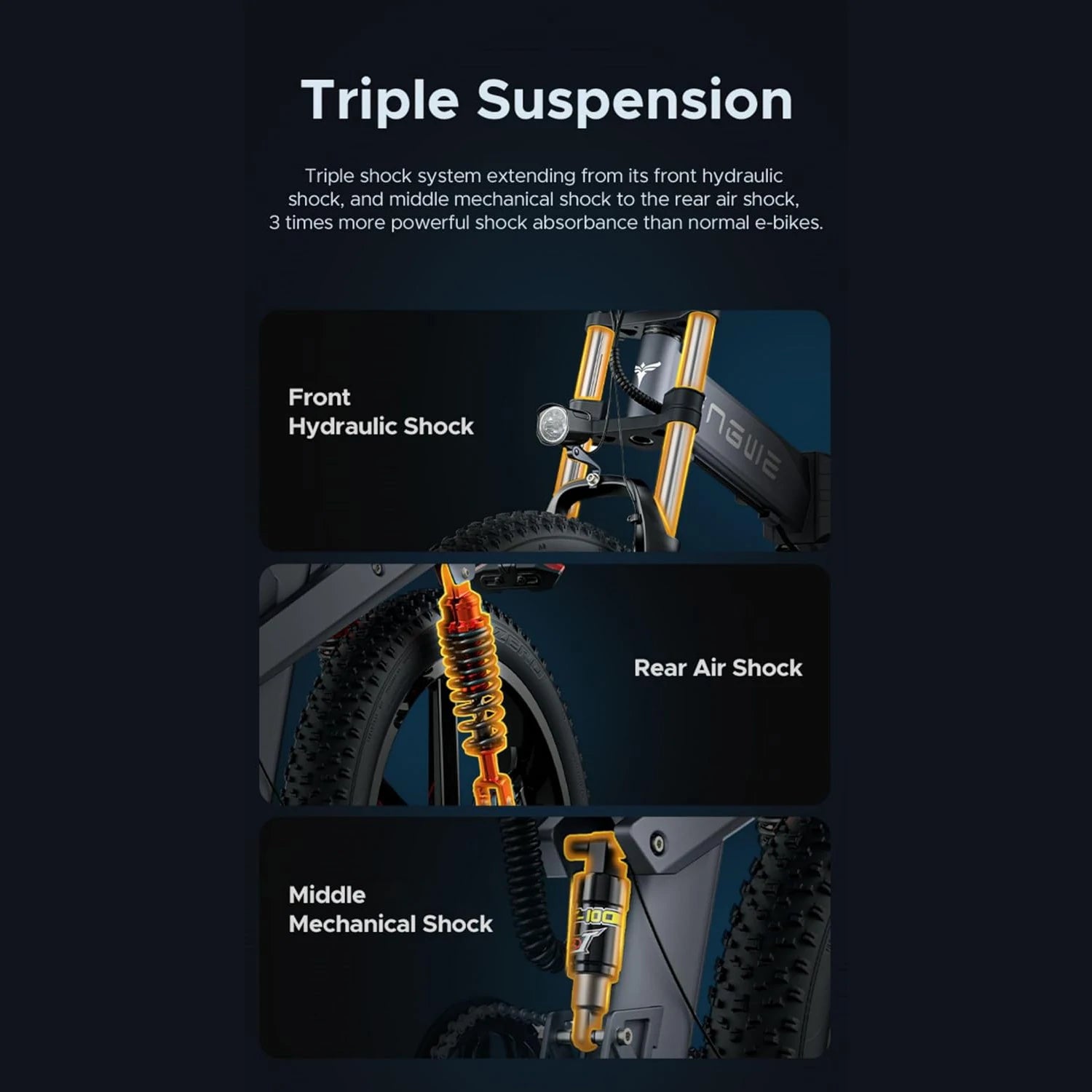 Full Suspension System & Variable Speed System :The full suspension ebike is perfect for heavy off-road or long downhill.Electric moped cycle bikes adopts lockable and adjustable double shoulder front suspension downhill fork and rear suspension.8-speed variable system allowing you to effortlessly switch gears to match your riding needs. Additionally, the step-up lectric bike is equipped with a gear sensor, providing added protection for both the E bicycle and gearbox.
