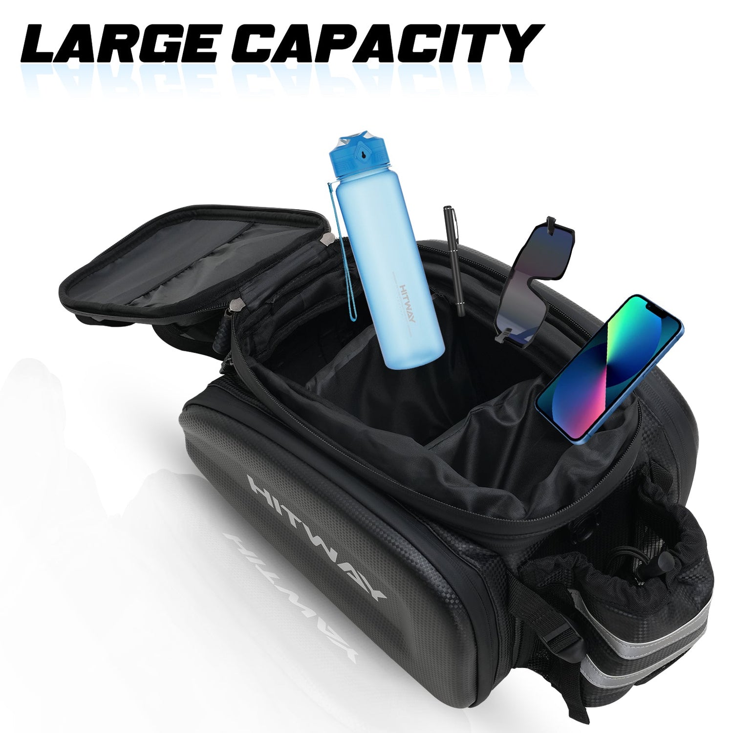 HITWAY GB2 Bike Rack Bag Portable and convenient, this product comes with an adjustable padded shoulder strap and a sturdy top handle, allowing you to easily carry it wherever you go. The padded sides of the bag not only maintain its shape, but also provide cushioned protection to keep your belongings safe. The GB2 also comes with a rain cover and strategically placed reflectors for increased visibility even in low-light conditions.