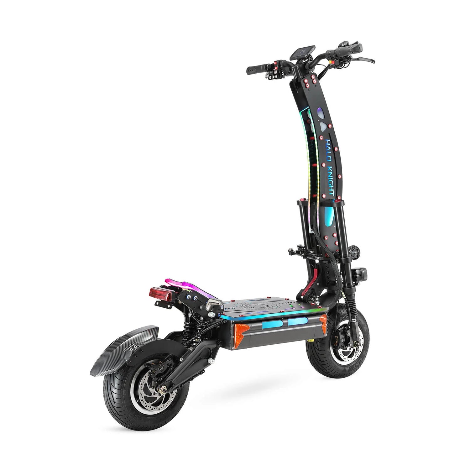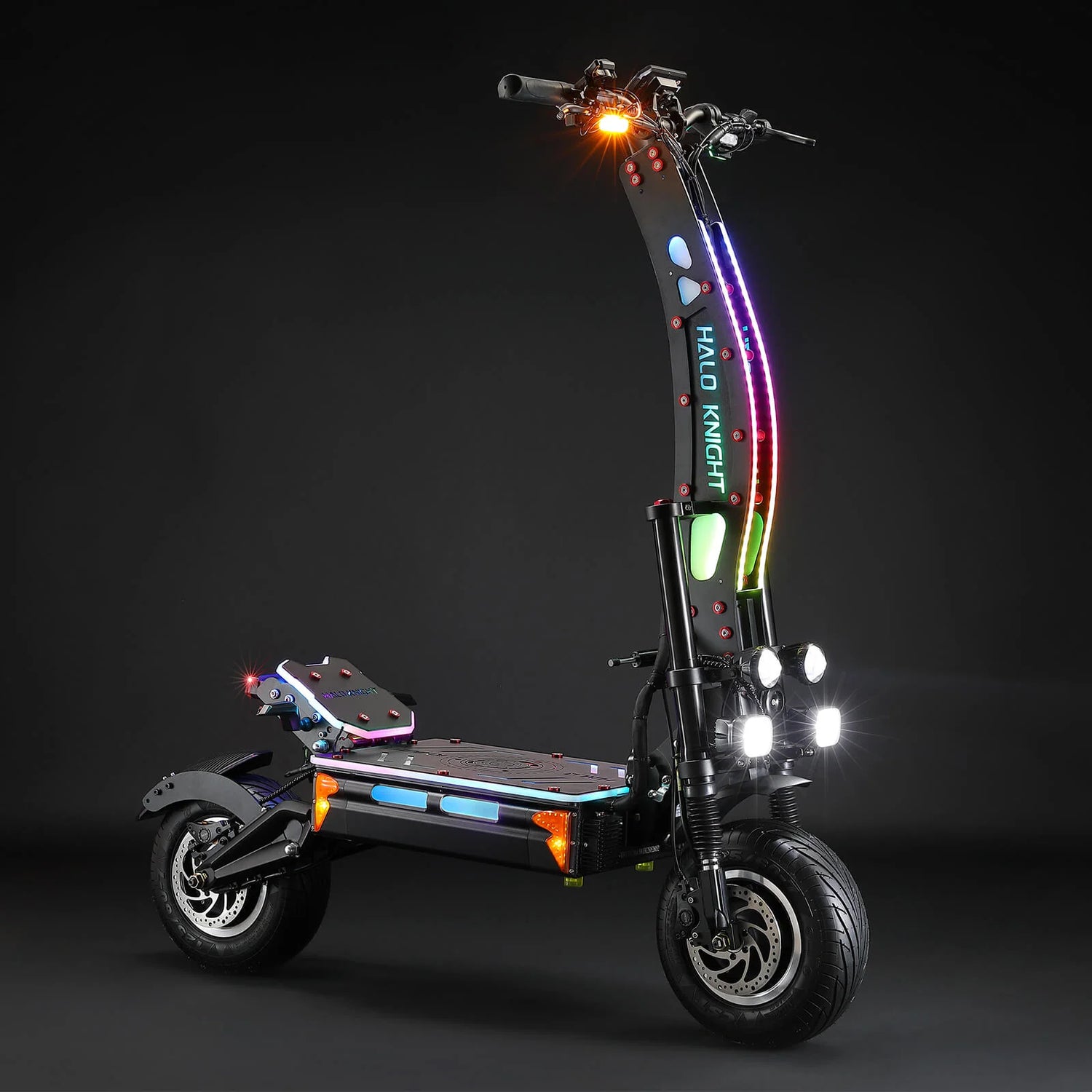 Features a full suite of professional lighting: Square Lights, Apollo Lamps, High/Low Beam Lights, Strobe Lights, Double Flash Lights, Front/Rear Turn Signals, Hub Lights, Corner Lights, Driving Lights, Brake Lights, and full-body RGB lights (for the upright, deck, and footrest)〞all controllable via a remote. Its artistic design and beautiful lighting create a fashionable riding experience.