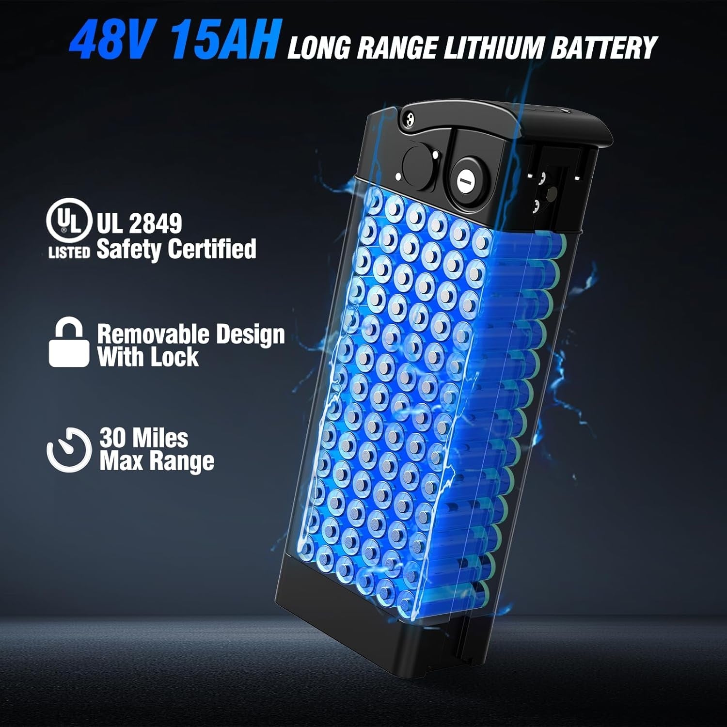 [HIGH CAPACITY BATTERY]48V 15AH ebike battery with 3A fast charger can be quickly recharged in 3 hours, providing you with up to 30-45km of power for your ride (pedal assist mode)
