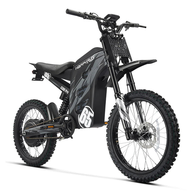 The fully upgraded 2025 HappyRun G300 Pro, with an aluminum alloy forged frame and a newly developed 6500w (Peak) high-performance motor, is the most cost-effective off-road electric dirt bike! The drive wheel torque is greatly increased, the throttle curve is adjustable, and there are multiple riding modes, so you can enjoy riding in the wild and show the strongest off-road power. Based on the 3rd generation HappyRun power, it is equipped with higher performance off-road brakes, high-quality motorcycle aluminum alloy front forks, independently developed HR suspension system and innovative color digital screen function, which greatly improves the off-road performance of G300 Pro, balances urban commuting, and is suitable for a wider range of people.